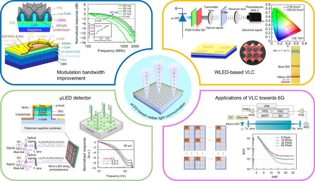 The evolution of next-generation cellular networks is aimed at creating faster, more reliable solutions. Both the next-generation 6G network and the metaverse require high transmission speeds. Visible light communication (VLC) is deemed an important ancillary technology to wireless communication. It has shown potential for a wide range of applications in next-generation communication. Micro light-emitting diodes (μLEDs) are ideal light sources for high-speed VLC, owing to their high modulation bandwidths. In this review, an overview of μLEDs for VLC is presented. Methods to improve the modulation bandwidth are discussed in terms of epitaxy optimization, crystal orientation, and active region structure. Moreover, electroluminescent white LEDs, photoluminescent white LEDs based on phosphor or quantum-dot color conversion, and μLED-based detectors for VLC are introduced. Finally, the latest high-speed VLC applications and the application prospects of VLC in 6G are introduced, including underwater VLC and artificial intelligence-based VLC systems.
